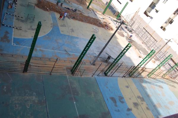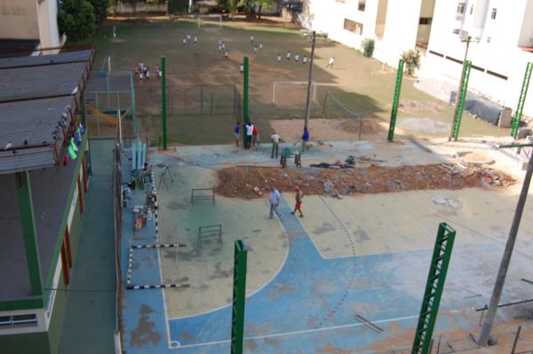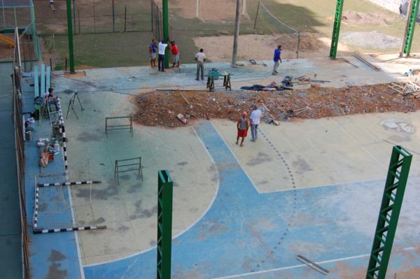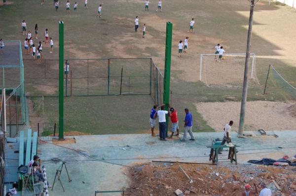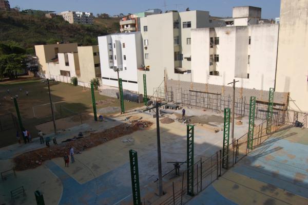 Homens trabalham arduamente na obra, que já está bem adiantada. A conclusão da obra é um sonho antigo do Diretor José Nicodemos Couto e de toda a escola. Sem dúvida, depois da conclusão das obras, a quadra da Escola São Paulo figurará entre as melhores de Muriaé.