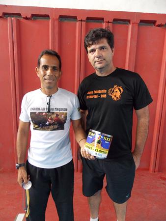 Professor Baldanza recebendo troféu das mãos do coordenador Cidinho
