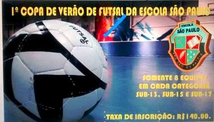 Vai começar a 1ª Copa de Verão Futsal da Escola São Paulo para as categorias sub 13, 15 e 17. O limite é de oito equipes por categoria. Maiores informações pelos telefones 98702-1705 ou 98836-6310.