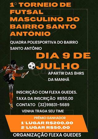 No próximo domingo irá acontecer um grande torneio de futsal no bairro Santo Antônio com a participação de oito equipes, inclusive algumas de cidades vizinhas. As equipes participantes são as seguintes: Lion, ADP Patrocínio, Crias do São Cristóvão, Santa Terezinha, Gladiadores (Barão), Flamenguinho, Inconfidência e Tropa da Ucrânia.